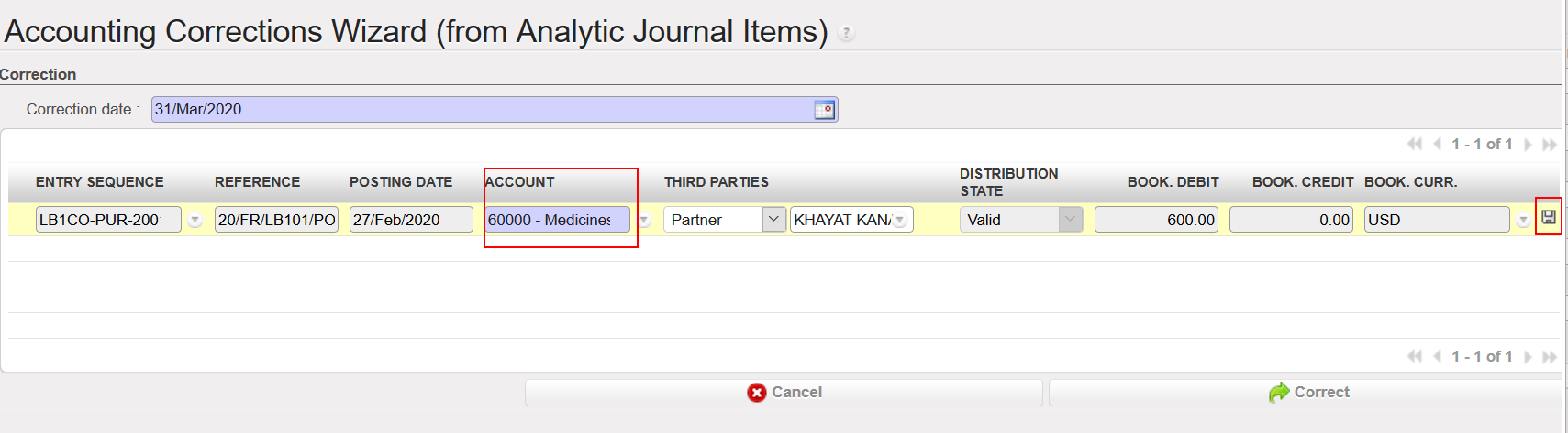 2. Correct the accounting code, then save the changes and click on {Correct}.