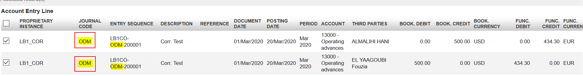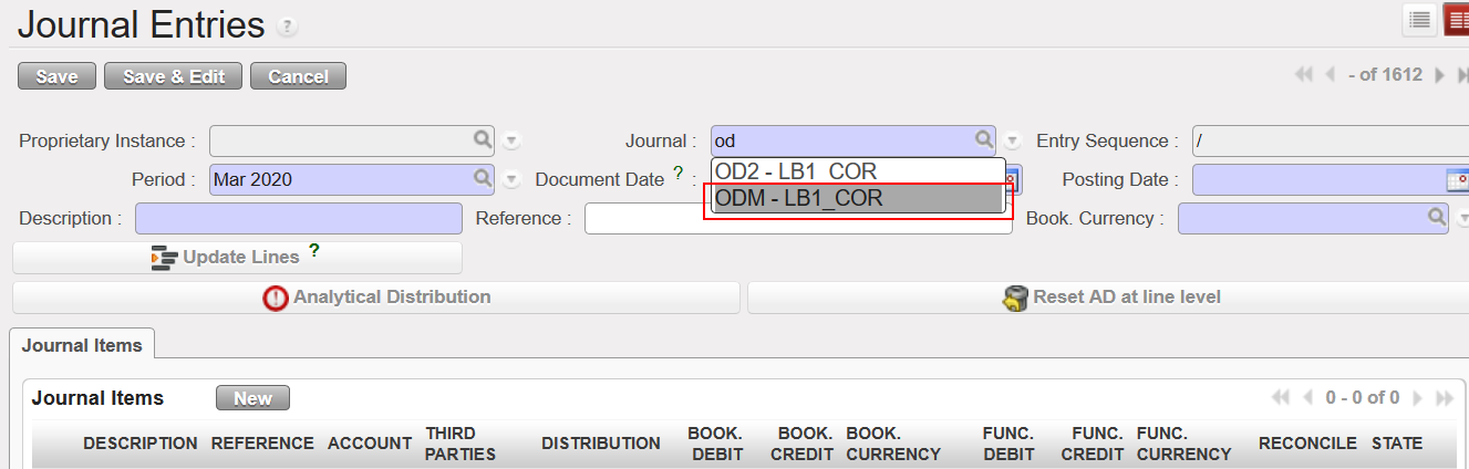 ODM (Manual OD): Journal Entries => Journal Entries=> {New}=> In the Journal field, choose ODM=> Complete all other information=> Save or {Approve}=> This manual correction will be booked in ODM Journal. Manual correction (OD) is mainly used when you want t0o correct a balance sheet account, third party, description and reference…etc for entries that were already posted, an any other correction that cannot be done in an automatic way.