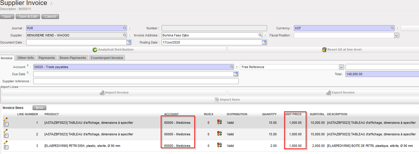 The Invoice Allocations report (PDF) Shows invoice lines allocation: analytical distribution (Destination, Cost centre, Funding Pool), Accounting code, quantity, unit price etc per invoice line. Additional note: To avoid certain corrections after validation of a Supplier Invoice, it is best to check the analytical allocations using this report, which gives a brief overview of all the important fields in the Supplier Invoice..