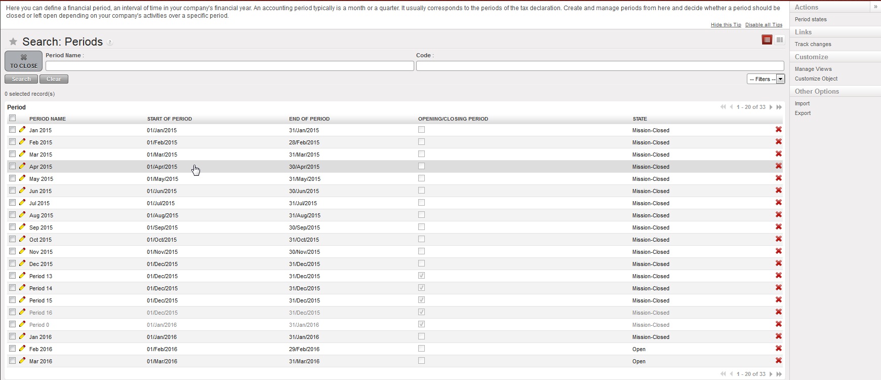 “Period” >> in project shows only regular periods (closed + open only), in coordo display more extra accounting periods
