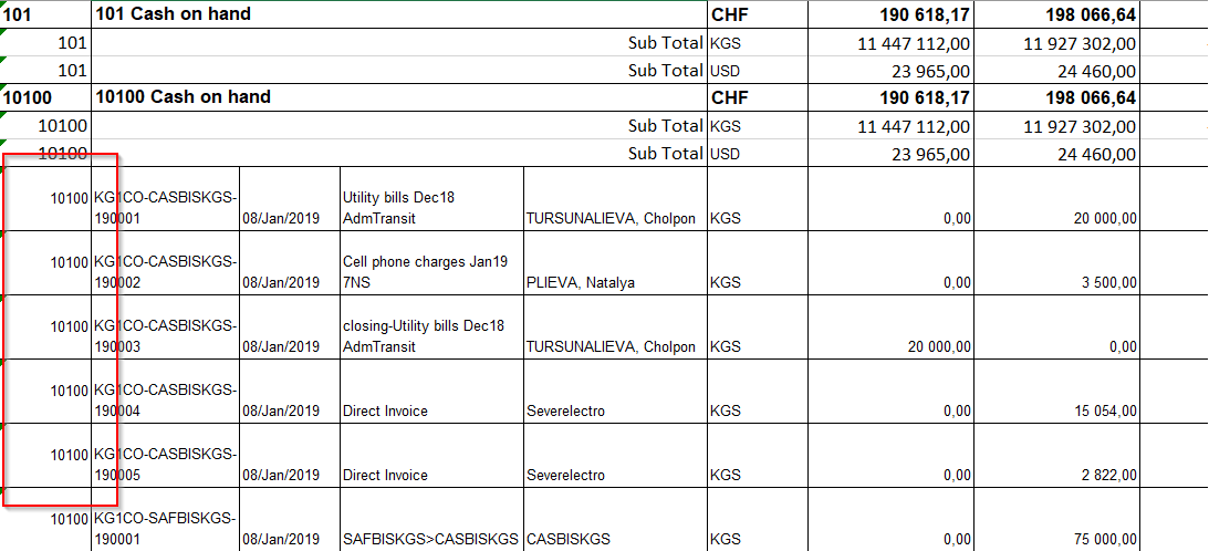 The Full report report (XLS) Excel output showing all entries in a register, including breakdown of invoice lines for imported invoices and analytical allocation. This report provides full detail to cross reference paper receipts and invoices. Additional note: It includes also record of deleted entries and all manual journal entries on corresponding liquidity journal..