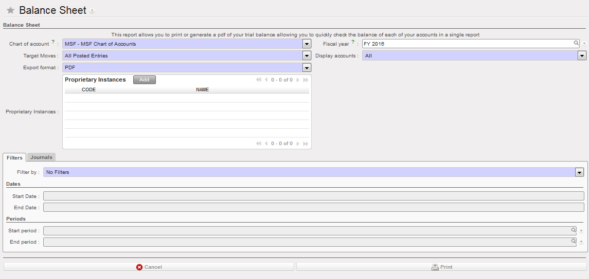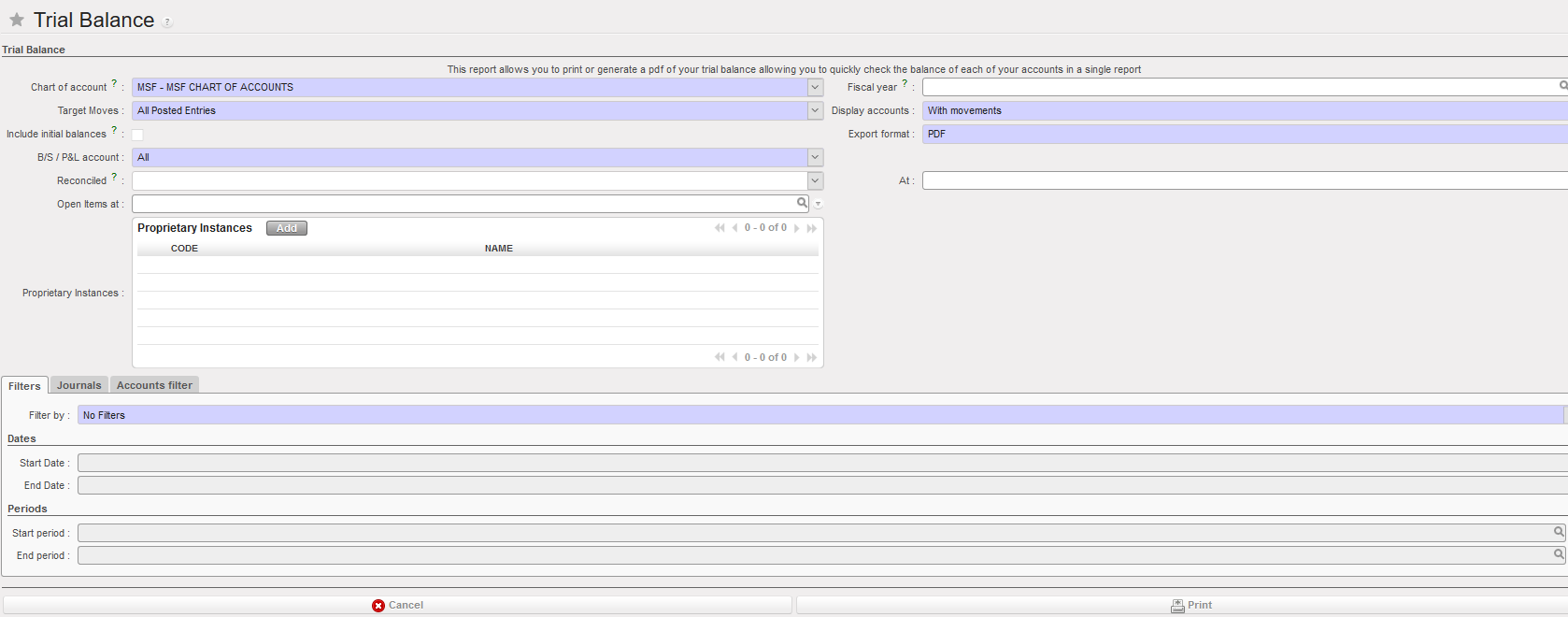 Go to Accounting > Reporting > Legal reports > Accounting Reports