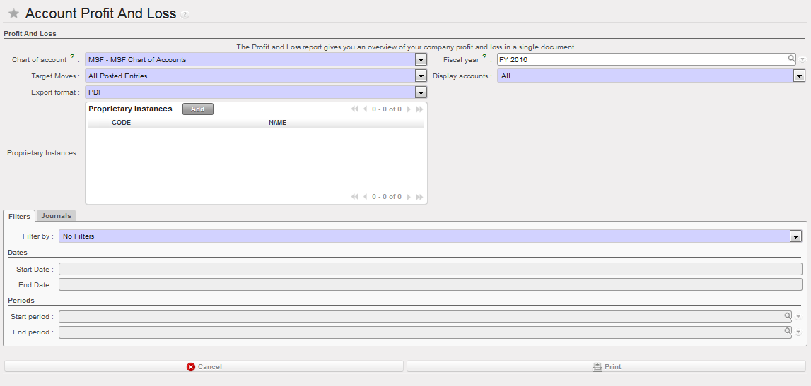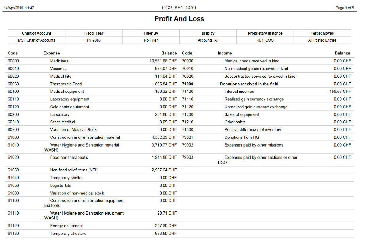 The Profit & Loss report (PDF or XLS) PDF or Excel report, lists expense and income account balances. Additional note: The Profit & Loss reports expense and income per accounting code and potential under spending (net profit) or overspending (net loss)..