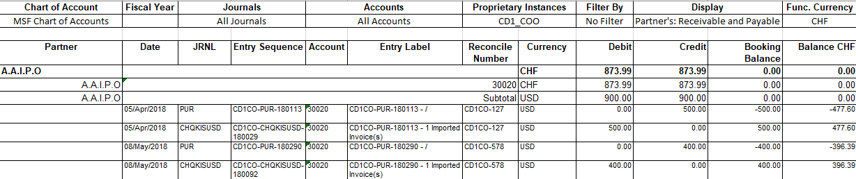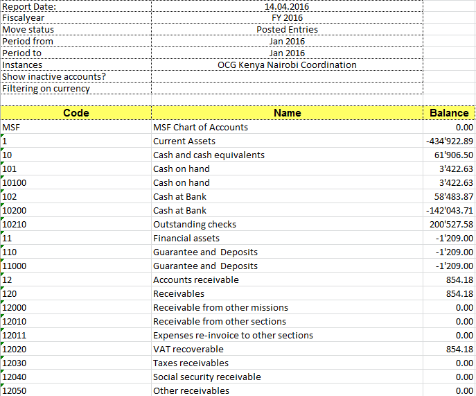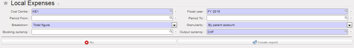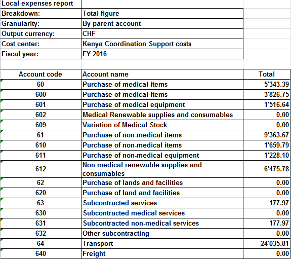 The Local Expenses report (XLS) Excel report of all expenses purchased or settled locally, in order to get a better overview of cash flow needs or to meet specific requirements from local auditors asking MSF to report on local expenses.