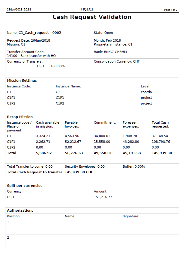 The Print report report (PDF) Invoice hard-copy, available for all kinds of invoices / refunds, donations and inter-mission vouchers. It can be used for filing or internal communication purposes.