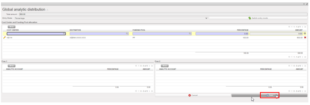 If the analytic distribution is 100% I will have the cost center, the destination and the funding pool filled in.