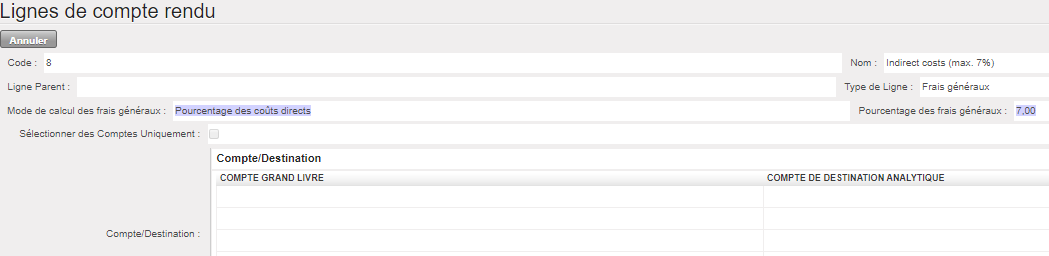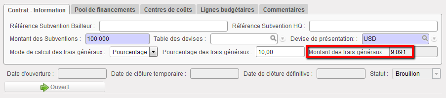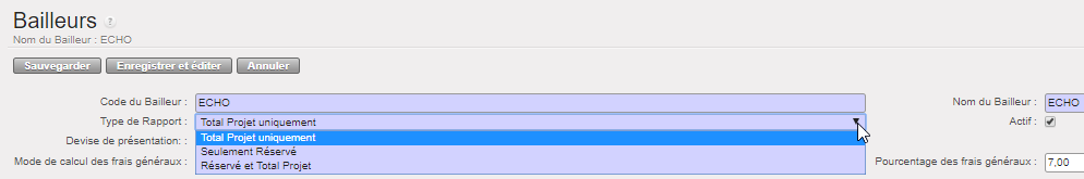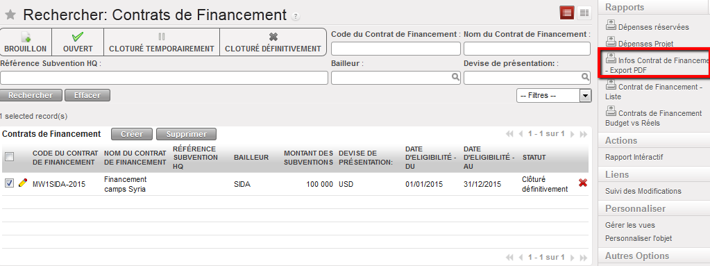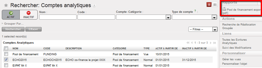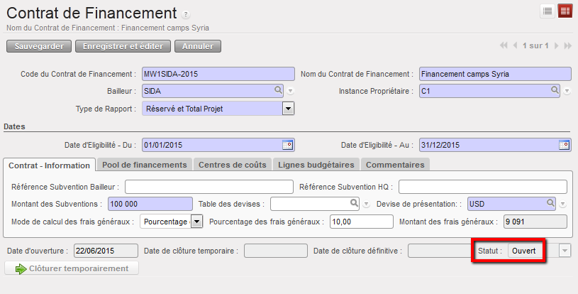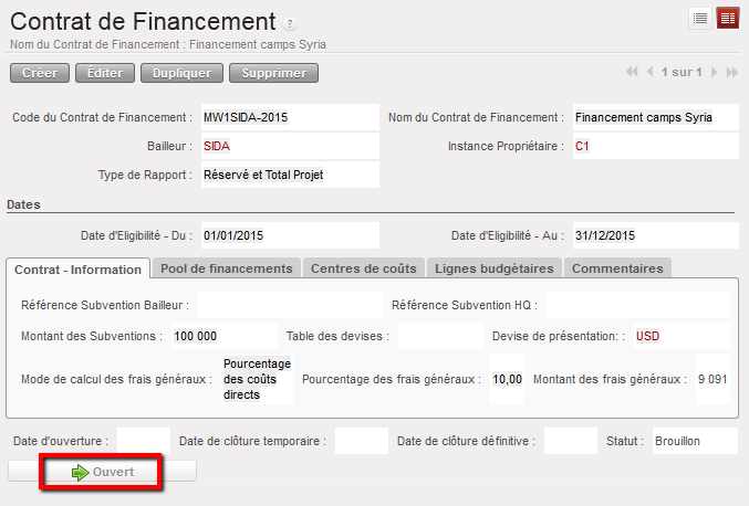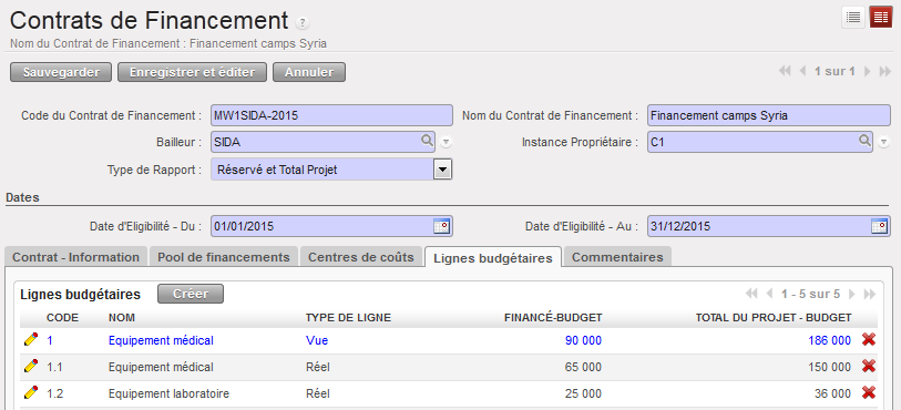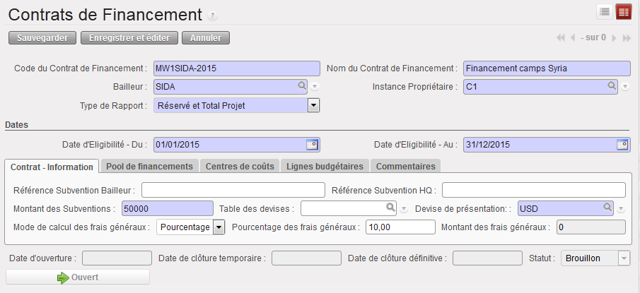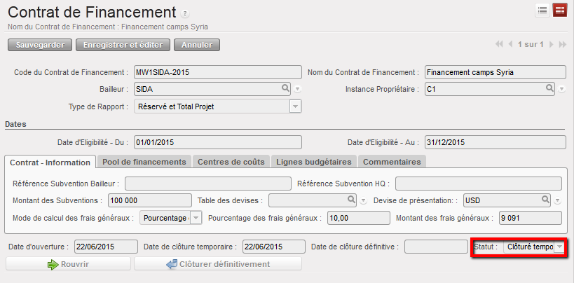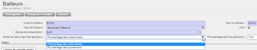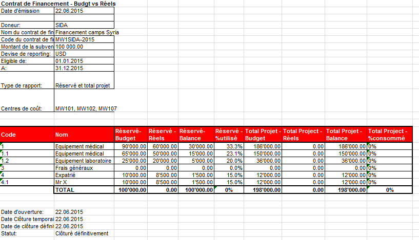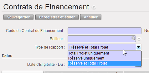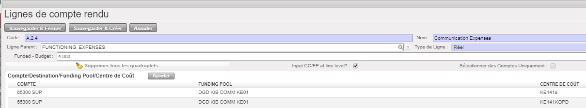 Supposons que nous ayons signé deux FC : les subventions A et B viennent de bailleurs exigeant un rapport de type « Réservé » ET « Projet total », pour un centre de coûts et des dates d’éligibilité identiques.