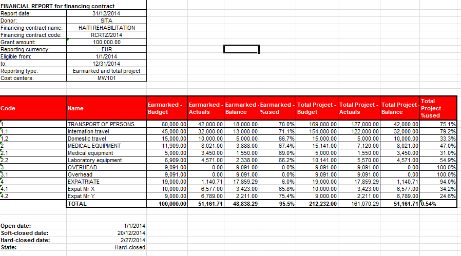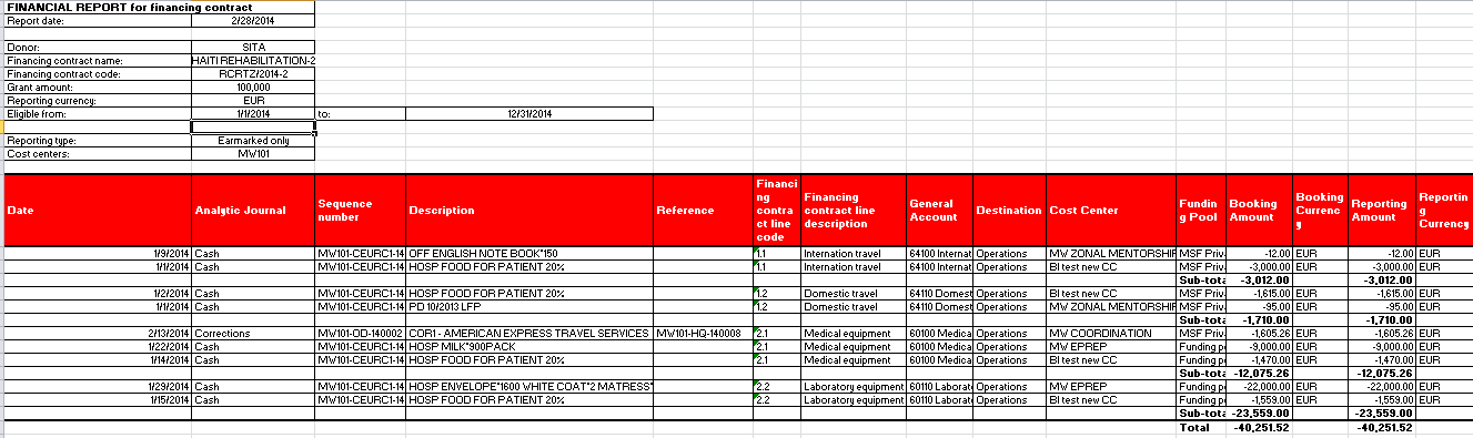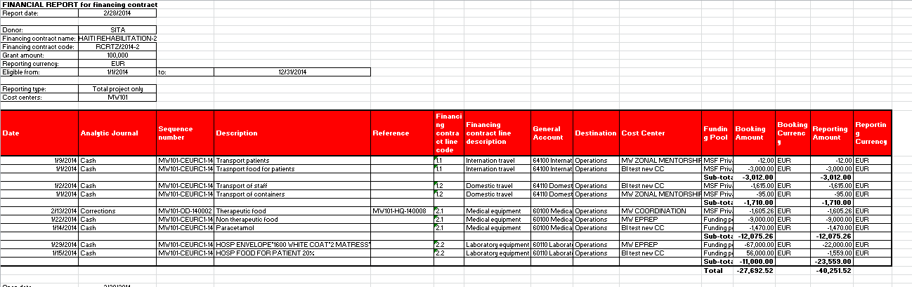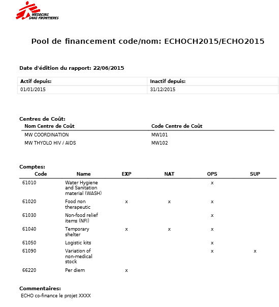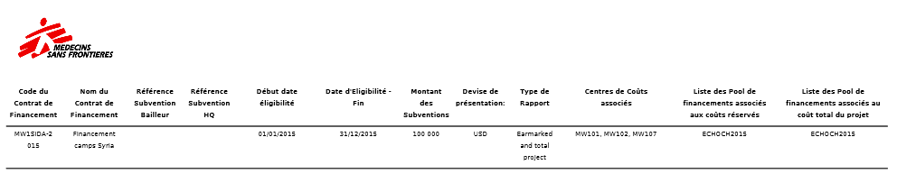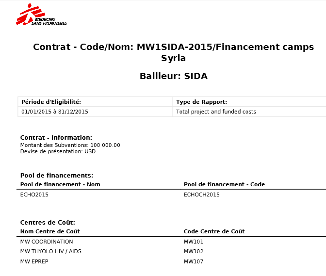 Le coût total réel du projet pour MSF est la somme des 4 FP, pour les mêmes dates et centres de coûts, exprimée dans la devise fonctionnelle de MSF. Remarque : les dépenses allouées au pool de financement PF ne seront pas incluses dans les rapports destinés à des bailleurs institutionnels.