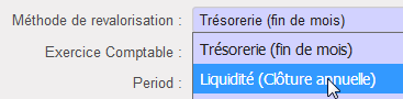 - La réévaluation se fait en deux phases. En premier, ouvrez l’assistant de réévaluation et sélectionnez l’option « Liquidité – Clôture annuelle » dans « Méthode de réévaluation »