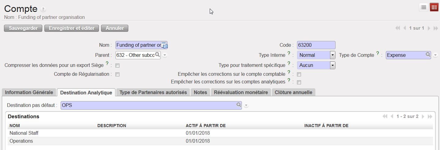 Dans cet exemple, le compte 63200 est associé à deux destinations, celle choisie par défaut étant « OPS »