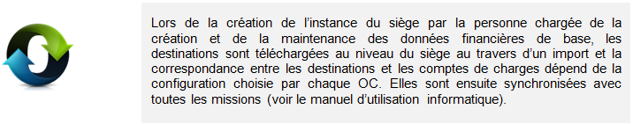 L’attribut {Cible} est utilisé à des fins de synchronisation et pour définir le centre de coût géré par l’instance propriétaire concernée. Si la coordination ou le projet gère plusieurs centres de coûts, plusieurs centres de coûts cibles seront associés à une seule instance. Exemple : une coordination qui gère le budget des interventions en cas d’urgence (EPREP) ou un projet qui gère un hôpital et les activités d’une clinique mobile. Un Centre de coût peut être configuré comme {Cible} dans une et une seule instance propriétaire.