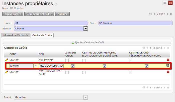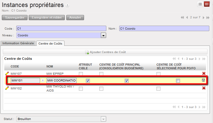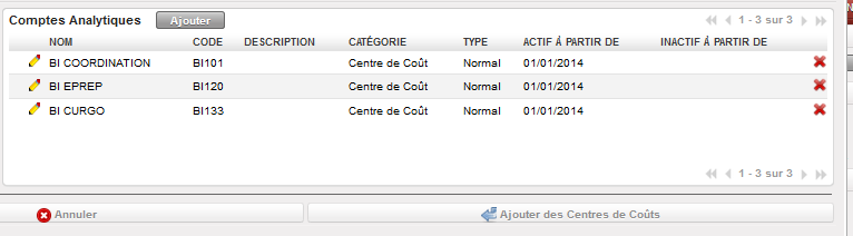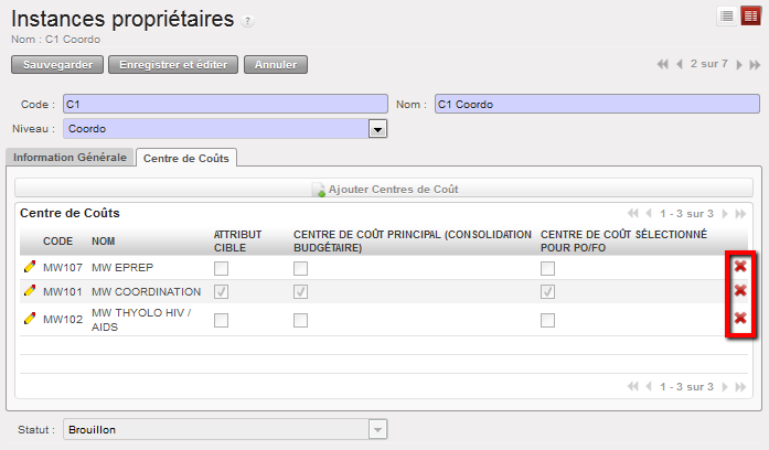 Si vous devez supprimer un Centre de coût de la série de centres associés à une instance propriétaire, cliquez sur la de la ligne concernée.