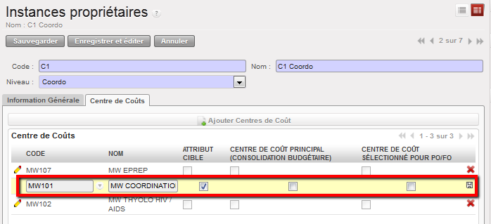Cliquer sur la croix située à côté de la ligne du Centre de coût permet de supprimer celui-ci de la configuration de l’instance propriétaire