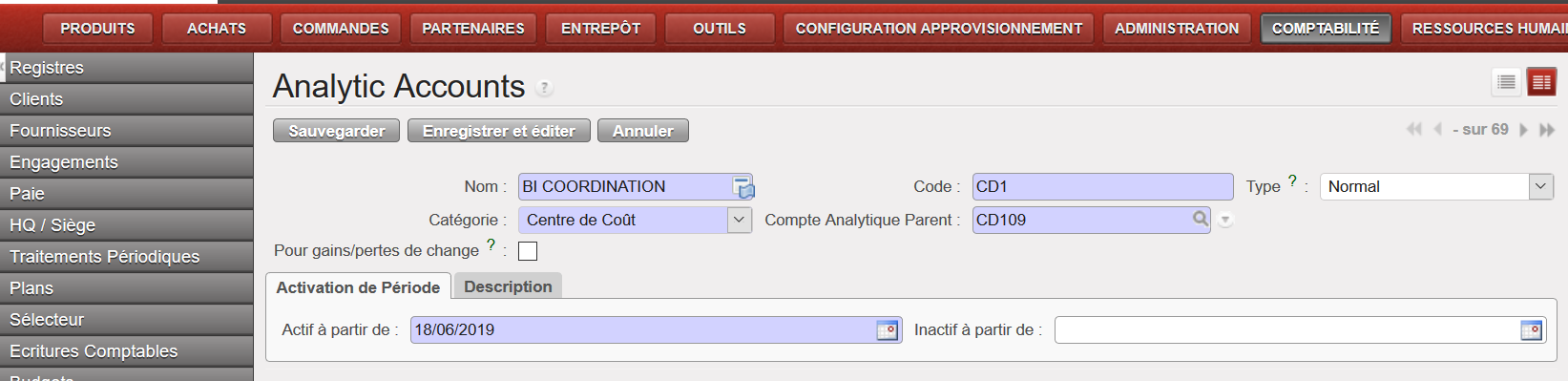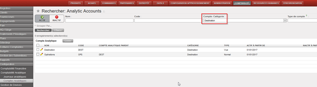 Enfin, les destinations, centres de coûts et pool de financements se trouvent sous Comptabilité/Configuration/Comptabilité Analytique/Comptes Analytiques