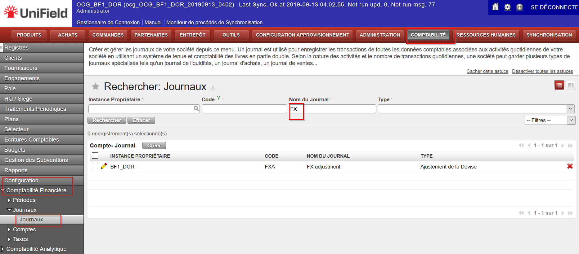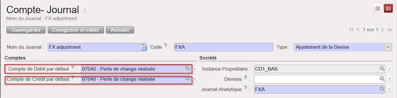 Code FXA : journal des ajustements de change, utilisé pour enregistrer des écritures comptables automatisées liées à des pertes ou gains de change.