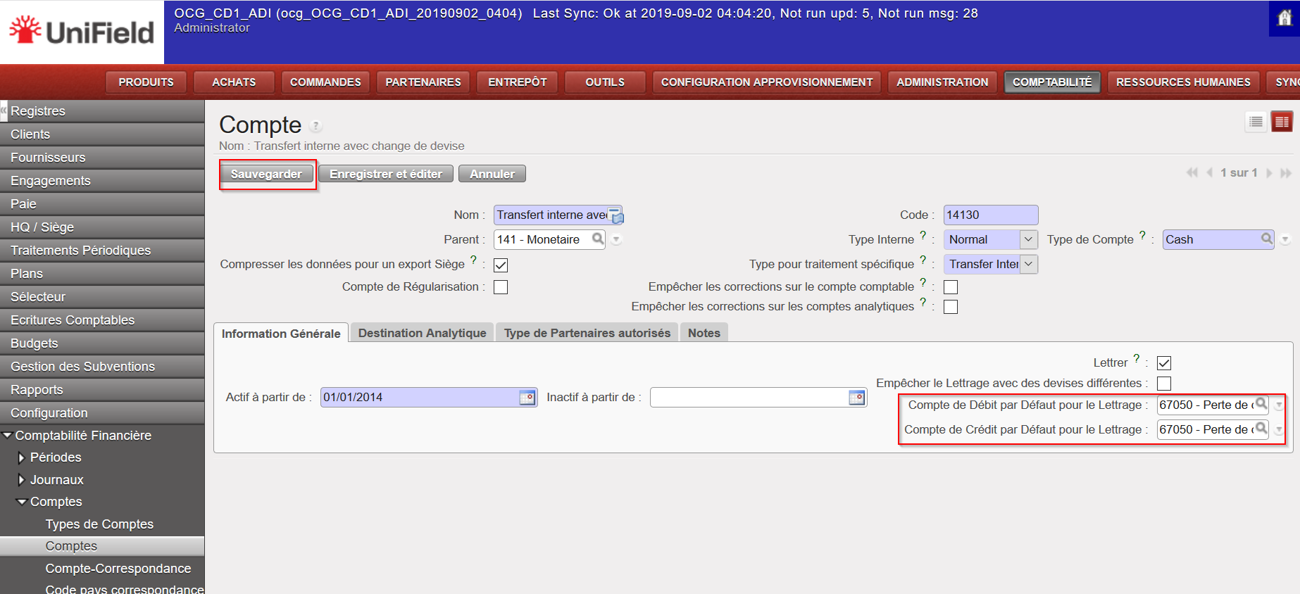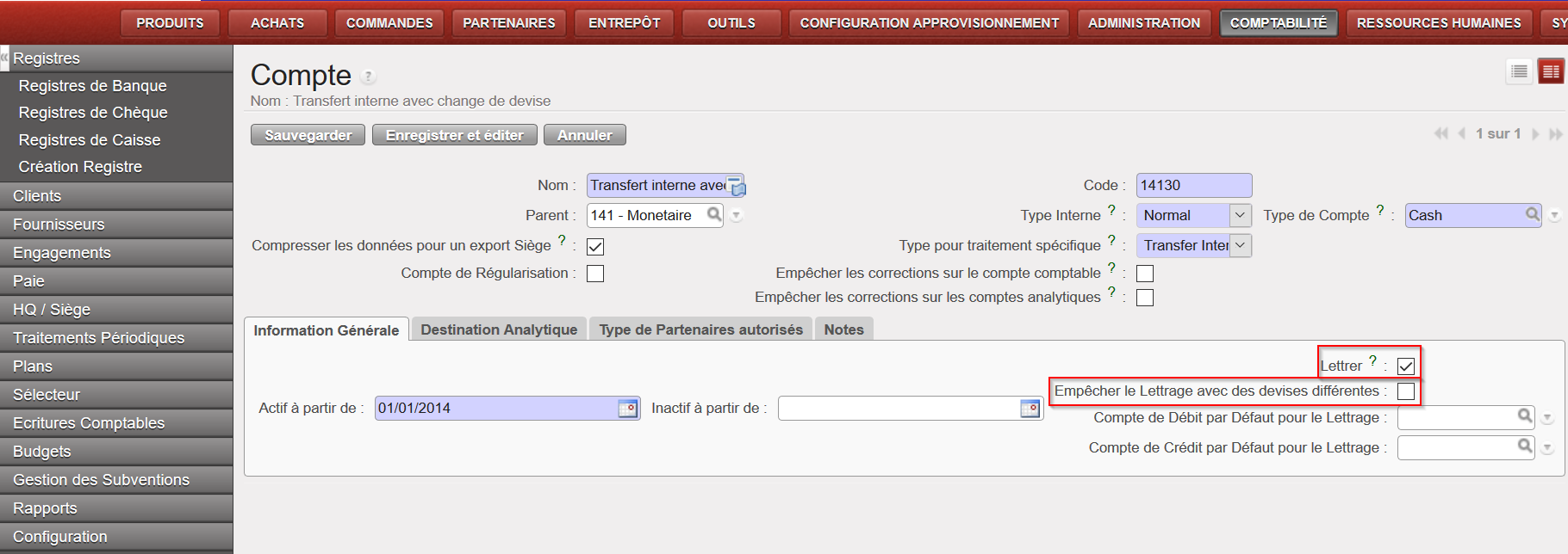 Par exemple, vous pouvez choisir d’avoir automatiquement le compte 67050 à utiliser pour toute entrée FXA liée au compte 14130 (taux de change de la devise de transfert interne) en définissant cela dans la configuration de ce compte, sinon le système continuera à prendre automatiquement le FXA par défaut. Compte défini dans le journal FXA (67040).
