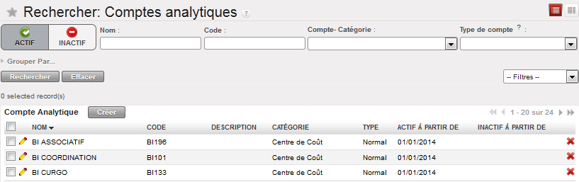 Écran de recherche des comptes analytiques affichant les comptes actifs