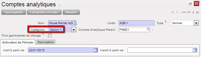 Complétez la fiche. Assurez-vous que la Catégorie soit définie comme Option 1 et le Type comme Normal. Le compte doit être associé au compte analytique parent OPTION 1.