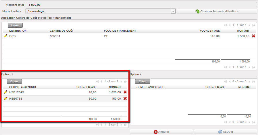Si une dépense doit être affectée à des centres de coûts ou pool de financements multiples, vous pouvez alors sélectionner le bouton {Créer} dans l’assistant Allocation analytique pour créer des lignes supplémentaires. Vous pouvez distribuer la charge par montant ou pourcentage en cliquant sur {Changer le mode d’écriture}. Pour rappel, les centres de coûts et pool de financements sont saisis manuellement. Les destinations, en revanche, sont proposées par défaut quand l’allocation est effectuée individuellement par ligne de registre ou de facture. Il est possible de modifier la destination par défaut.