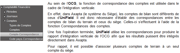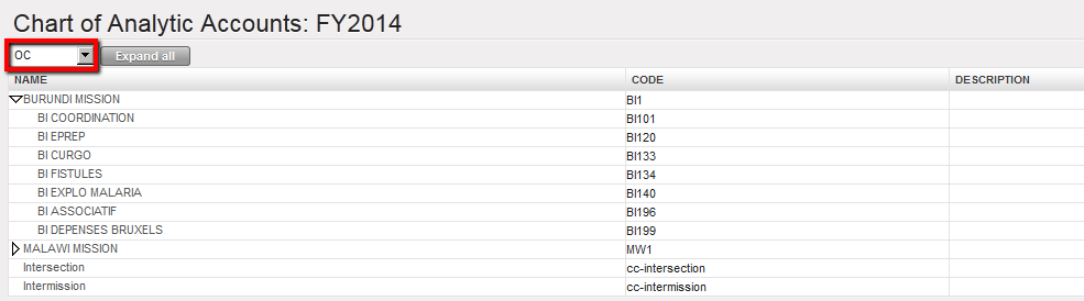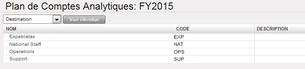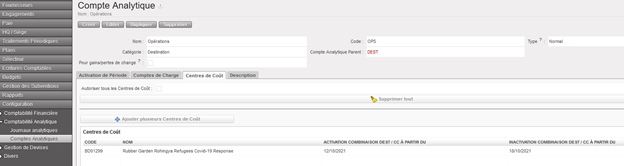 La configuration restreint les centres de coûts associés à une instance propriétaire définie. Elle permet de limiter la sélection des centres de coûts disponibles lors de la comptabilisation d’une entrée sur un compte de revenus ou de charges. Elle indique au système la façon de consolider les budgets au sein d’une mission et automatise les références des centres de coûts des PO (Purchase Order ou Bon de Commande) et des FO (Field Order ou Commande de Terrain). Il s’agit donc d’une tâche importante visant à assurer un suivi adéquat des charges et des revenus.