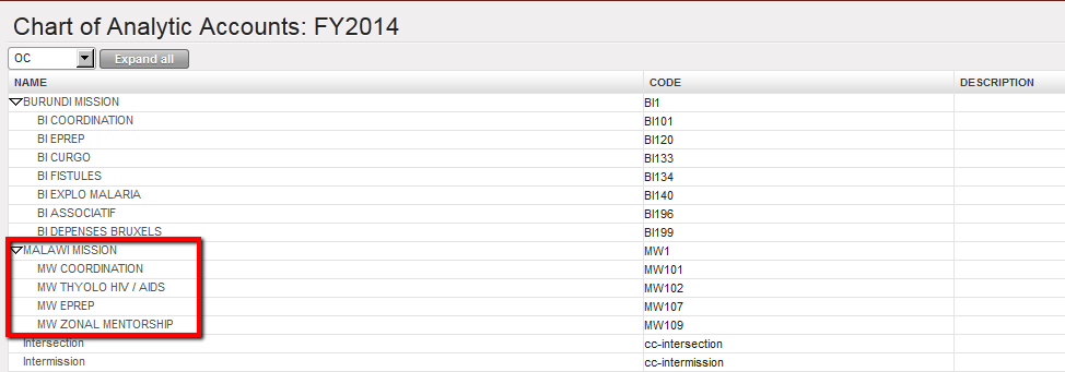 Vue par arborescence des centres de coûts de la mission du Malawi