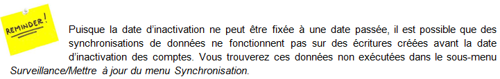L’inactivation est synchronisée vers les missions et les nouvelles écritures enregistrées sur des comptes inactivés sont bloquées.