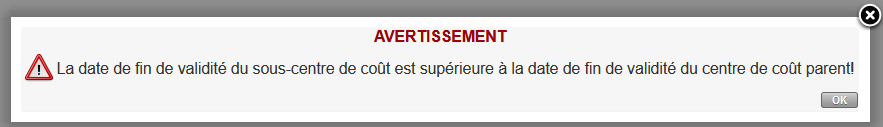 Au sujet des dates, il doit avoir une coherence, donc par logique, un sous-centre de coût (“fils”) ne peut pas avoir des dates d’activation inférieures ou supérieures au centre de coût principal (“parent”). Si c’est le cas, on aura des messages d’erreur et on ne pourra pas enregistrer le cost center.