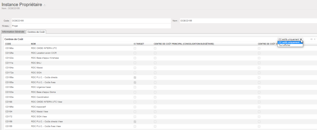 Vous pouvez filtrer les CC “actifs” et “inactifs” par le biais de la vue de formulaire de l’Instance propriétaire, comme indiqué ci-dessous : Allez dans ADMINISTRATION > Configuration > Paramètres > Instances propriétaires Dans “Code”, filtrez par code d’instance Cliquez sur l’onglet “Centres de coûts”. Le filtre est configuré par défaut avec “CC actifs uniquement”, lorsque vous cliquez dessus, il affichera également “Tout afficher” Lorsque vous sélectionnez “Tout afficher”, les inactifs sont affichés en rouge et les actifs en noir.