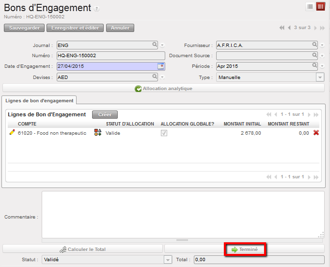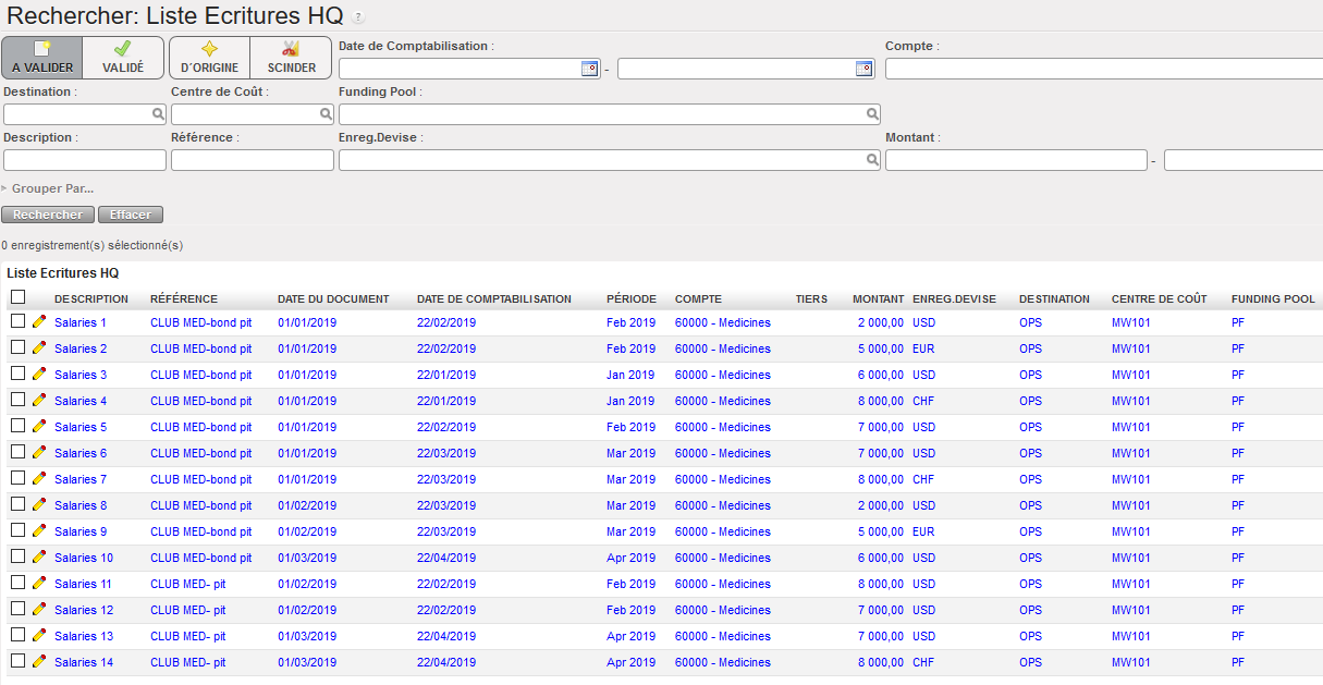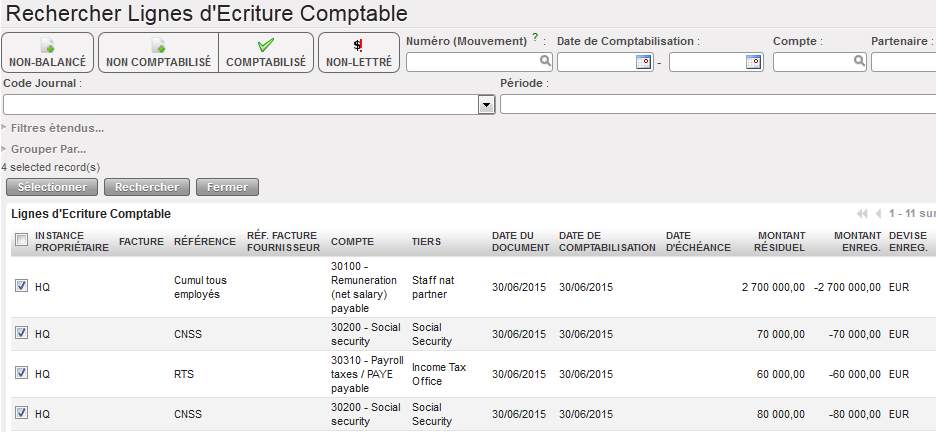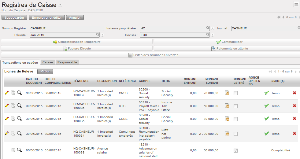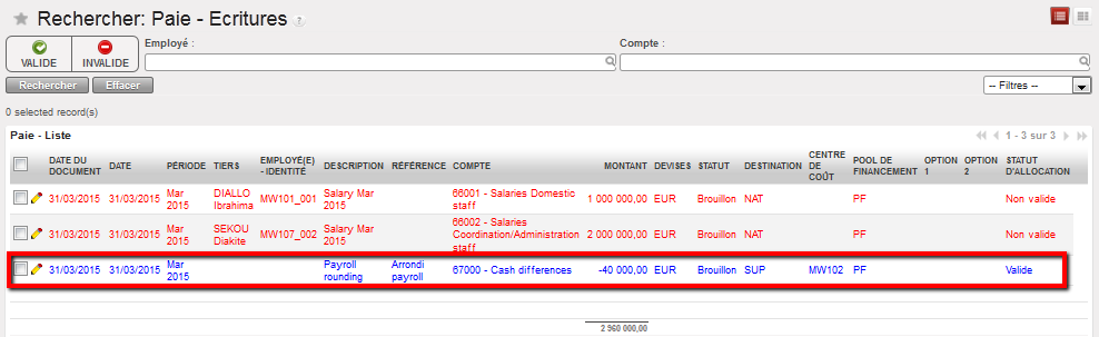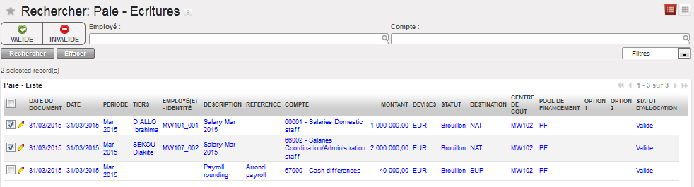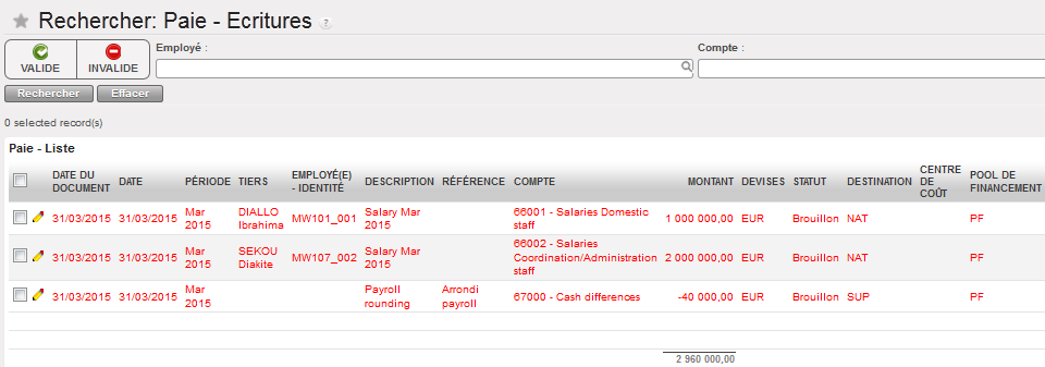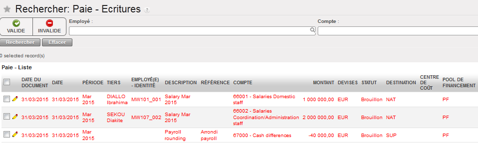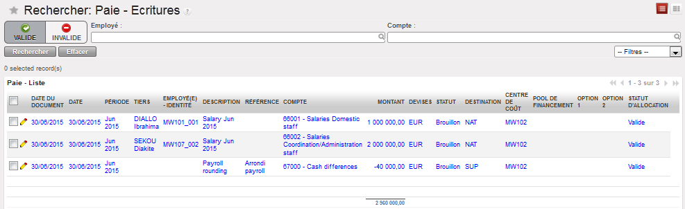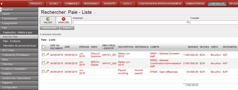 Lorsque les entrées de paie du personnel national sont importées, elles restent en mode « Brouillon » jusqu’à ce qu’un utilisateur autorisé les valide. Une fois validées, elles sont enregistrées dans les journaux.