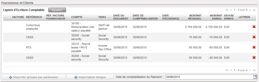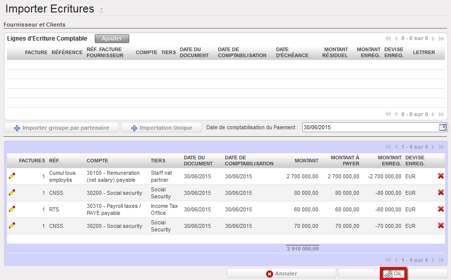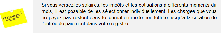 À ce stade, vous pouvez, si nécessaire, utiliser le crayon pour modifier des lignes. Si, par exemple, vous avez versé une partie du salaire par un registre de banque et une autre par le registre de caisse, vous pouvez modifier les montants afin de n’importer que le montant adéquat. Si vous ne versez pas tous les impôts et taxes en une fois, vous pouvez modifier les montants.