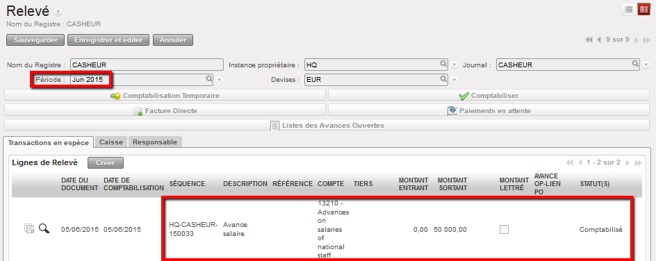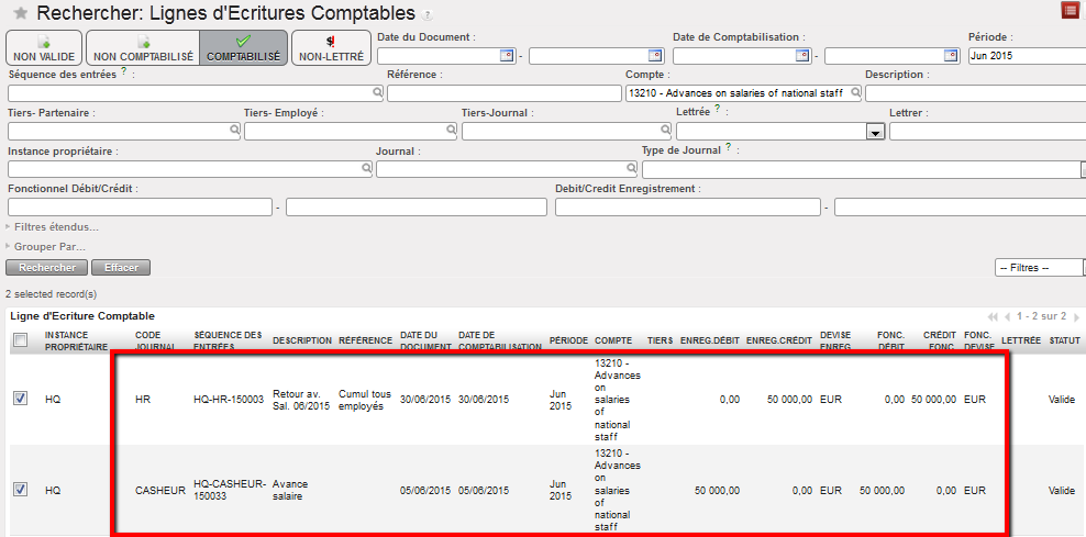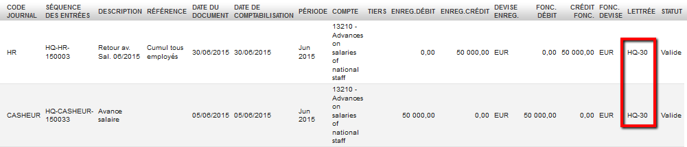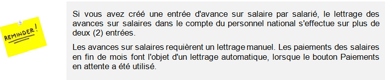 Comme nous l’avons expliqué ci-dessus, le montant total de l’avance sur salaire a déjà été comptabilisé en tant qu’entrée de paiement dans les registres. Toutes les entrées de paie doivent être lettrées manuellement sur le compte {Avances sur salaires du personnel national}.