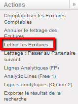 - Une fois les entrées extraites, cochez les cases des entrées du compte {13210} et sélectionnez {Lettrer les Ecritures} dans le menu Actions.