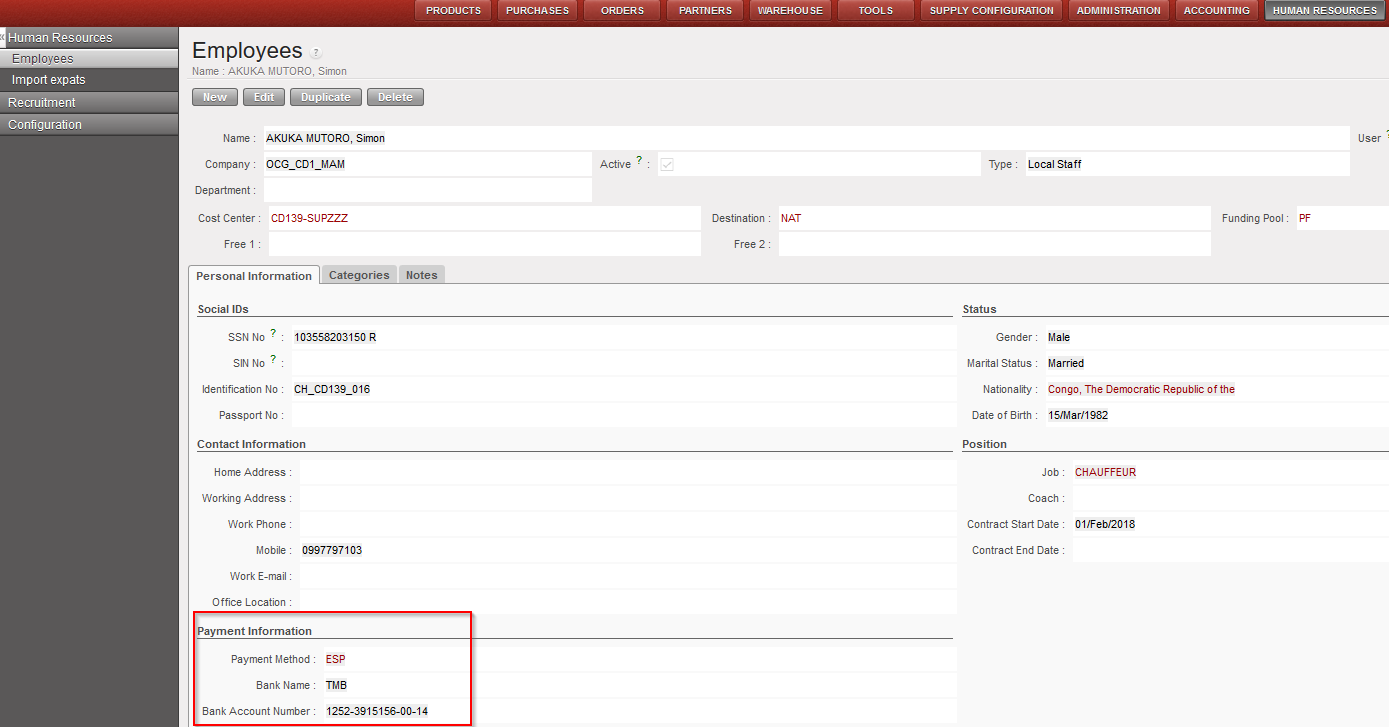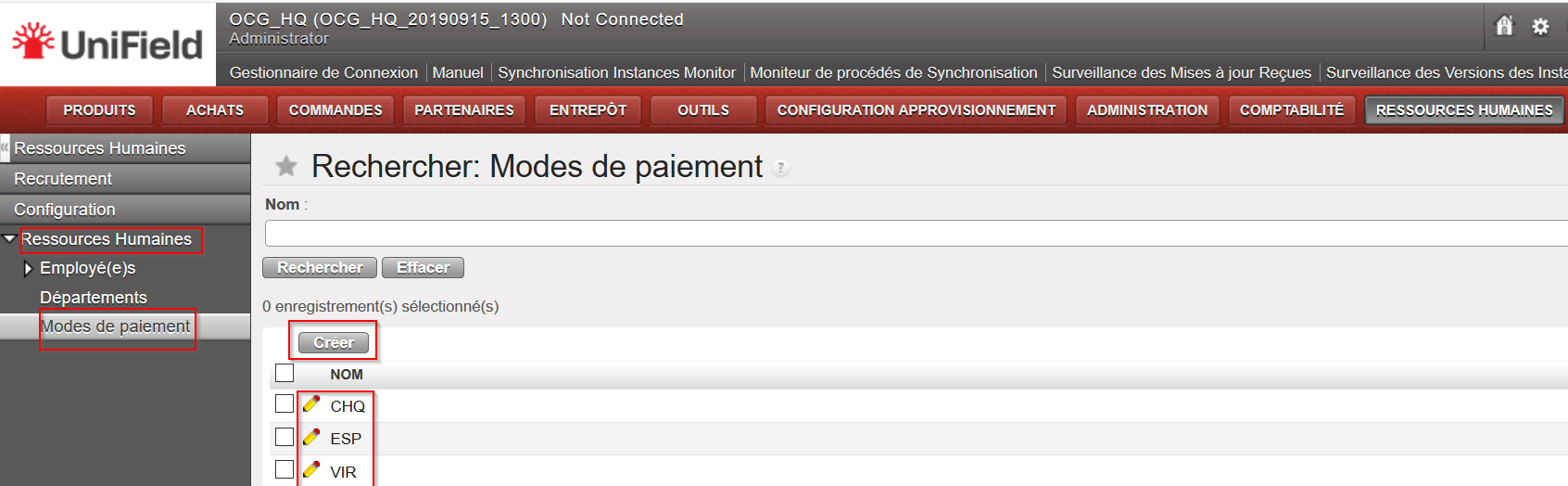 - Que pour le HQ: Ressources Humaines / Configuration / Ressources Humaines / Modes de paiement / {Créer}