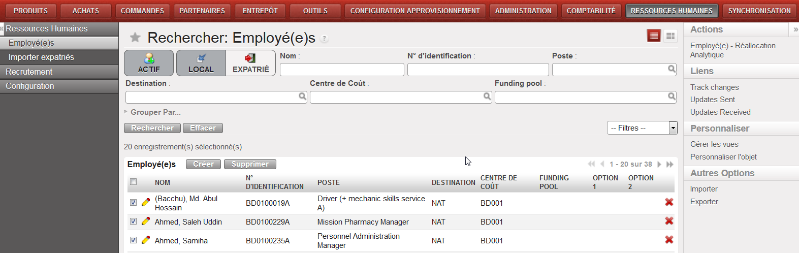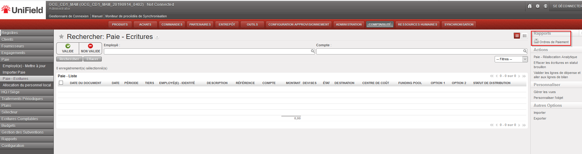 Lorsque les données sur les salariés ont été actualisées dans UniField, les entrées de paie peuvent être exportées d’Homère et importées dans UniField.