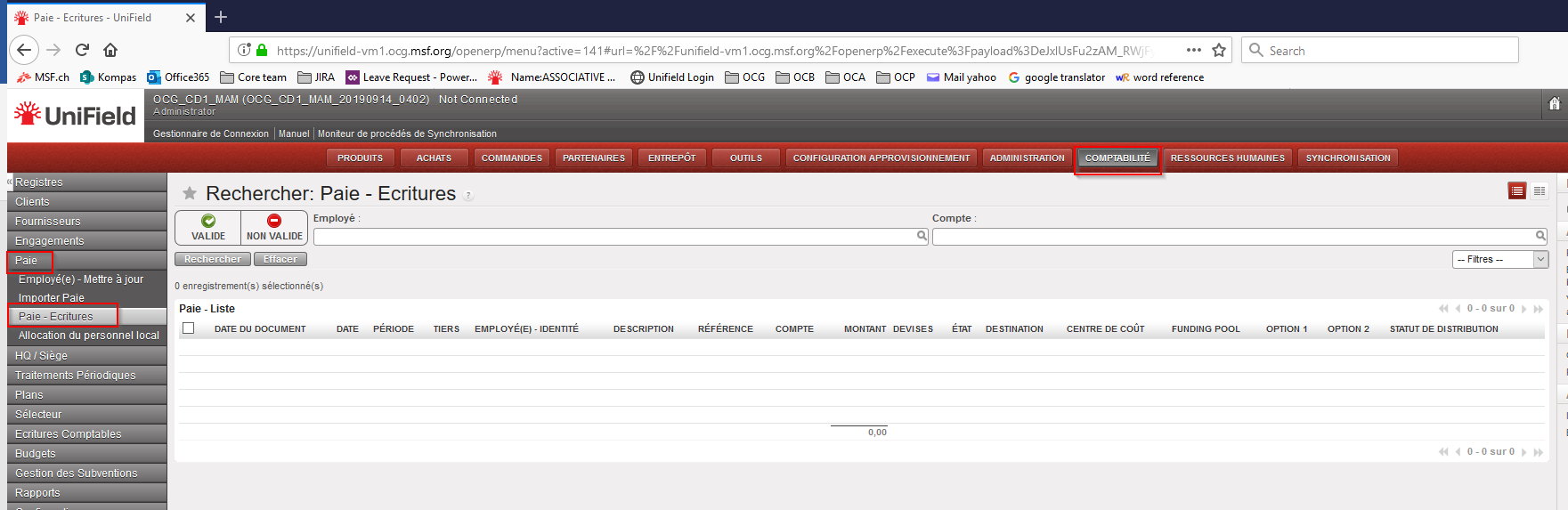 - Pour voir les écritures de paie il faut aller a Comptabilité/Paie/Paie-Ecritures dans le menu d’actions de la gauche.