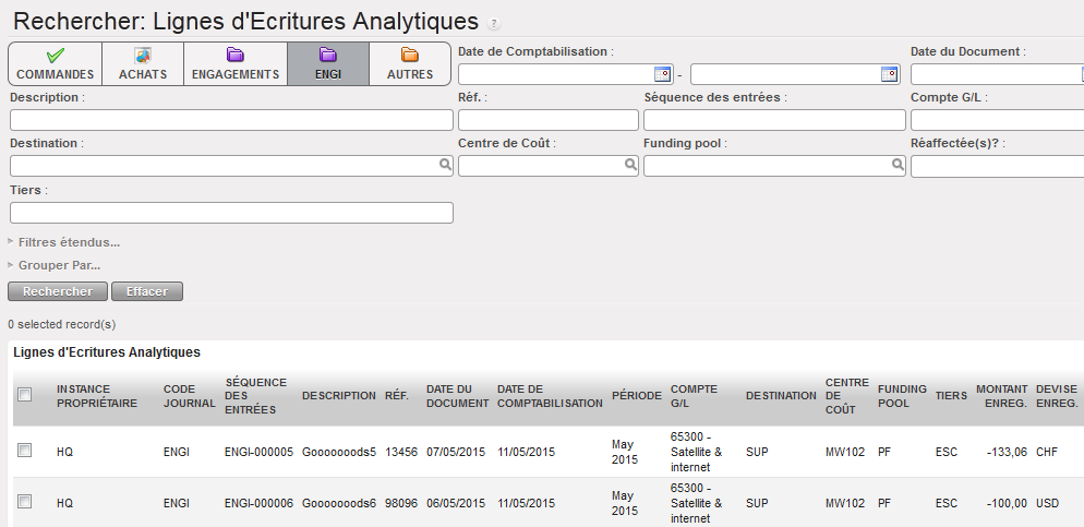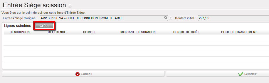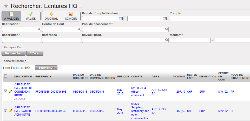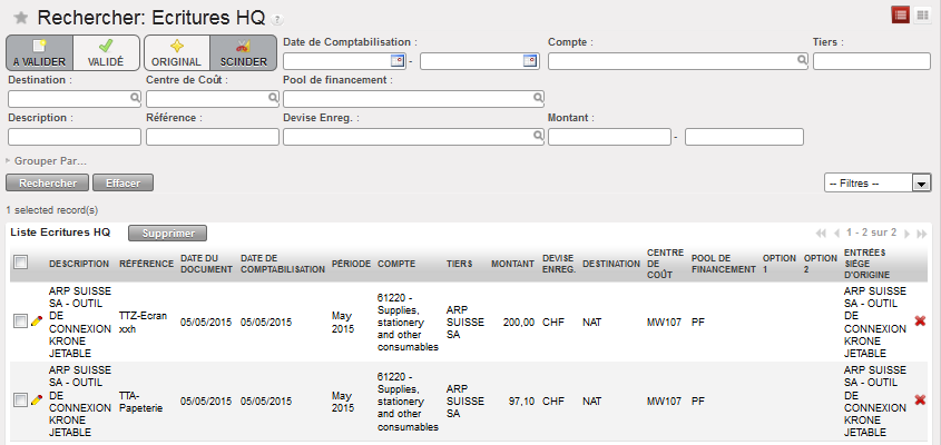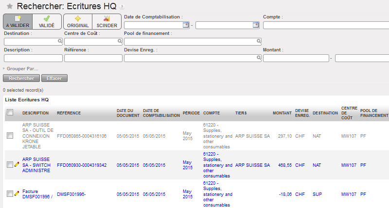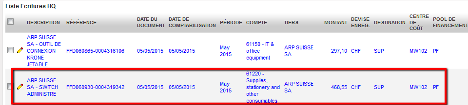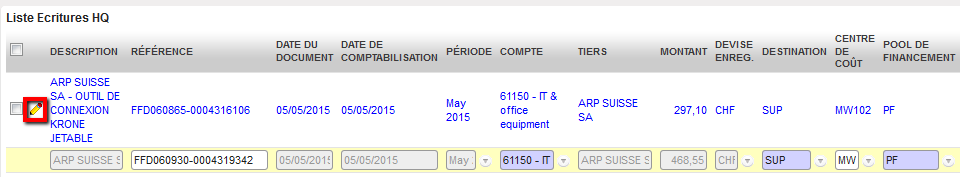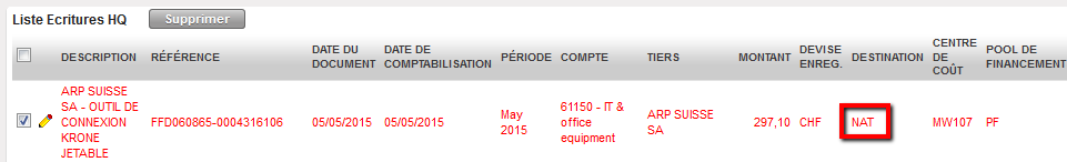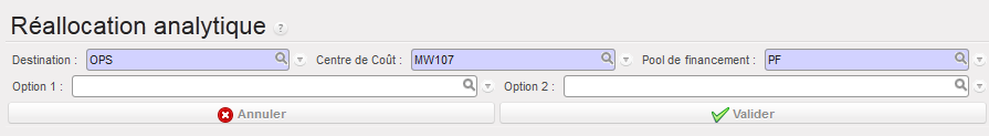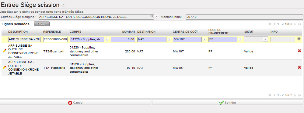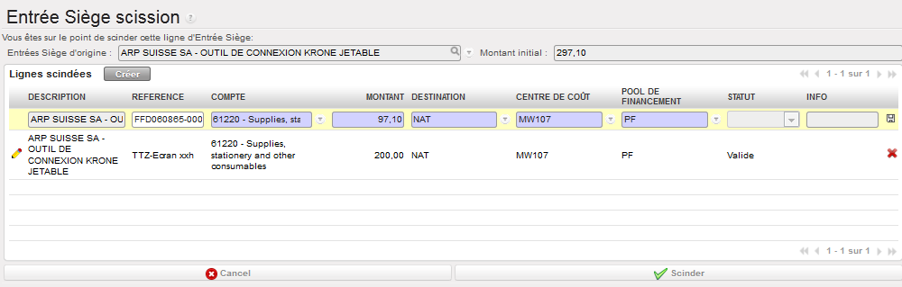 - Modifiez la destination, le centre de coûts et le pool de financement, pour rendre les entrées valables.