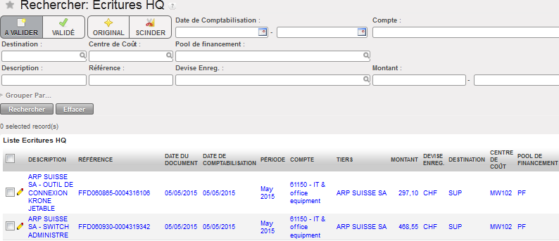 Fenêtre de recherche {Paie- Ecritures} affichée dans le sous-module {Paie-Ecritures}
