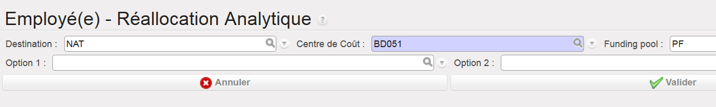 Si vous souhaitez modifier les informations analytiques de manière permanente, vous pouvez utiliser le sous-module de mise à jour des employés. Toutefois, dans certaines situations spéciales, il se peut que seule une période de paie des membres du personnel doive être actualisée. Pour rappel : seules les entrées ayant la même allocation analytique peuvent être allouées en même temps.