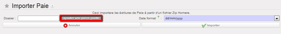 - Cliquez sur {Ajouter une pièce jointe} et, via le navigateur, recherchez le fichier que vous souhaitez importer (EX. : PAYE_SAGA_XXX).