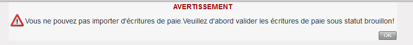 S’il y a déjà des entrées de paie dans la liste des entrées de paie, vous ne pourrez pas importer un nouveau fichier. Vous devez supprimer les entrées initiales avant de procéder à l’import. Vous recevrez l’avertissement suivant :