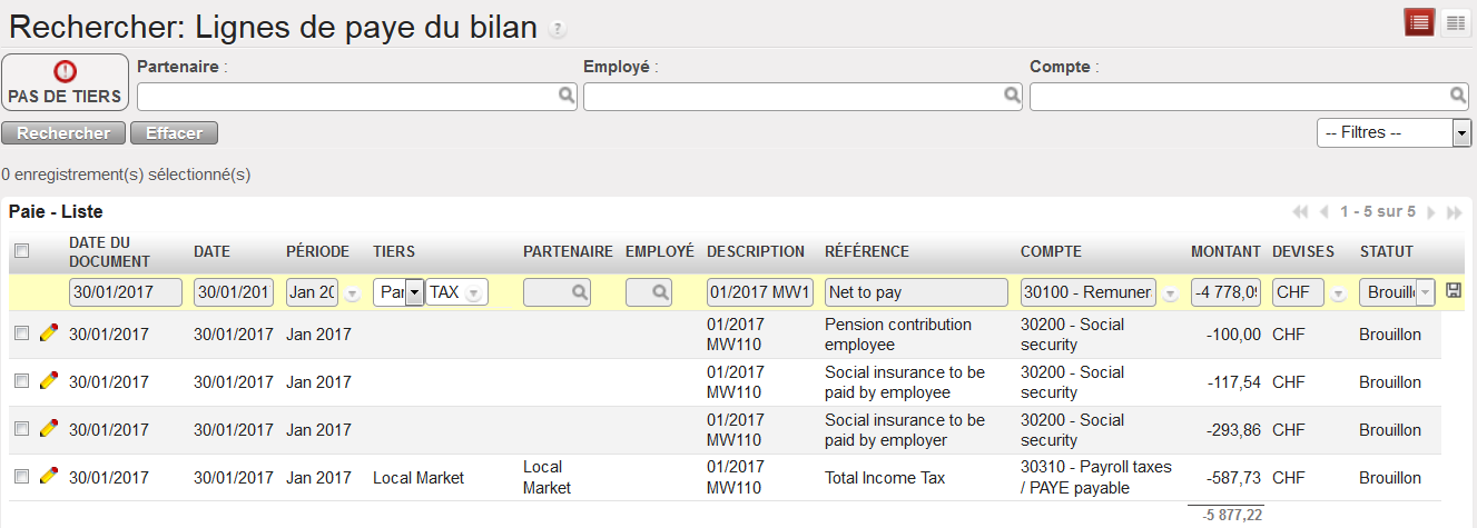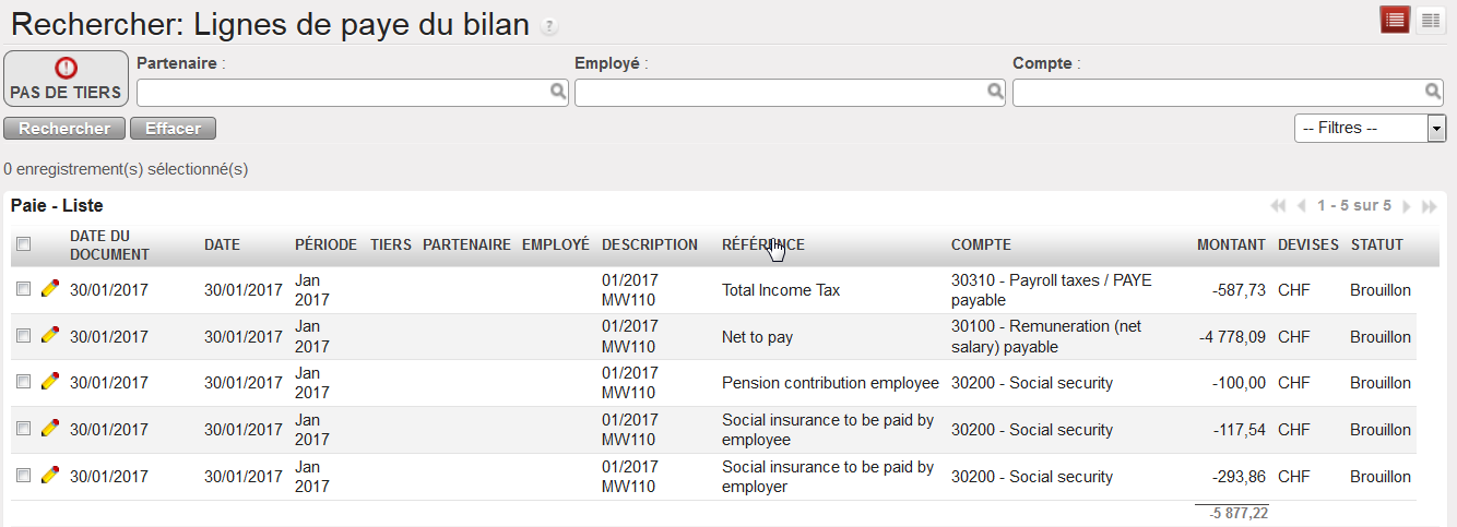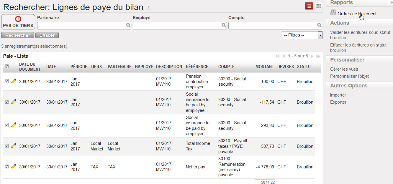 3. Cliquez sur {OK}. Une liste d’entrées de Paie en mode Brouillon se crée.