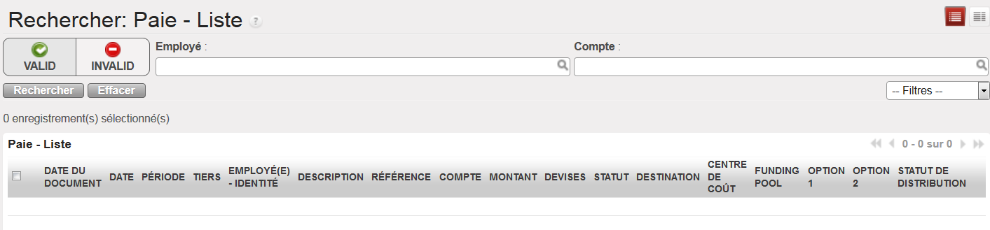 Vue {Recherche Paie Liste} après la validation des entrées paie