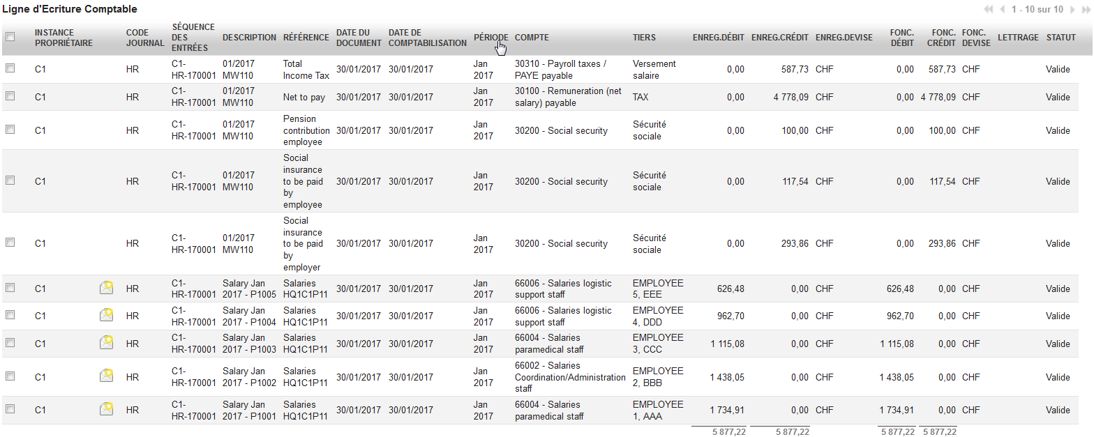 Lorsque les entrées de paie sont validées, elles deviennent comptabilisées et s’affichent dans les Journaux {HR}.