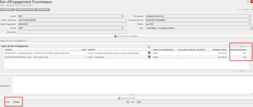 - Complétez les champs. Sélectionnez le {COMPTE} {13210}.