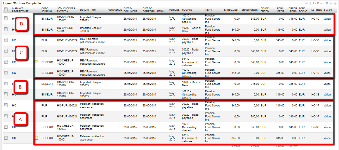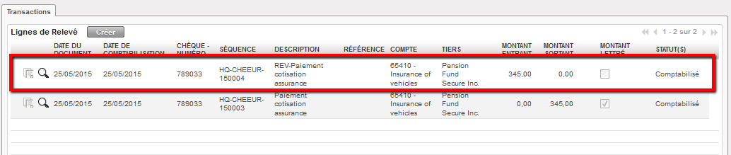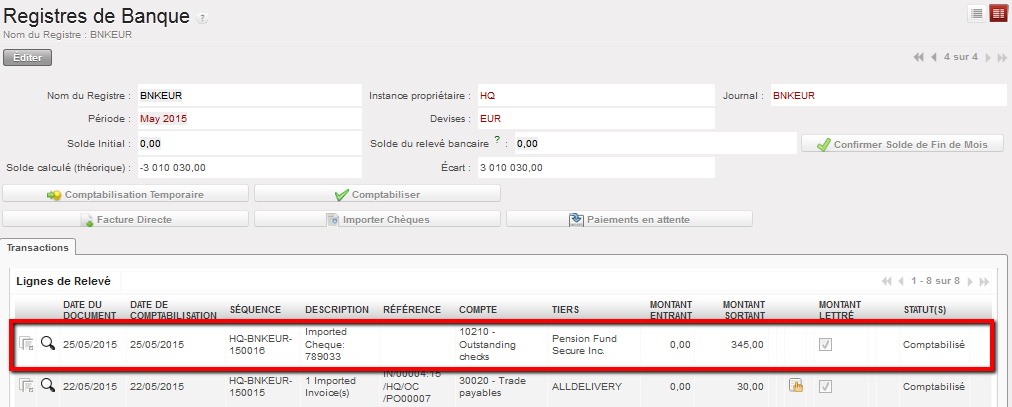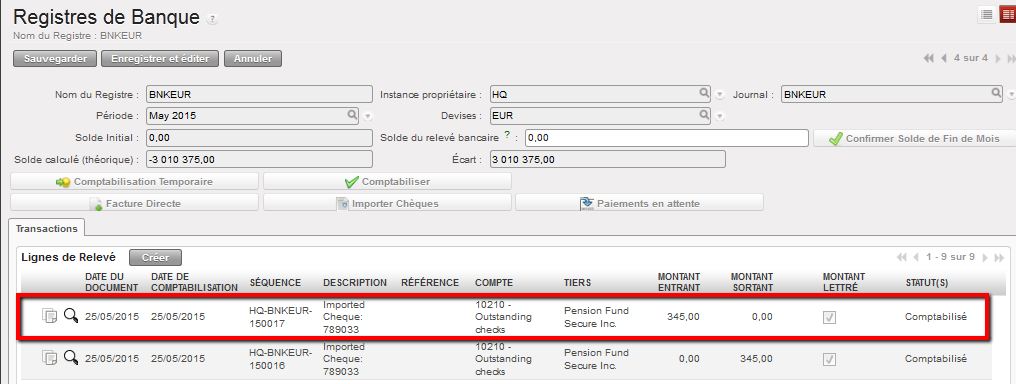Lignes d’écriture du chèque original et de contrepassation importés dans les registres de banque