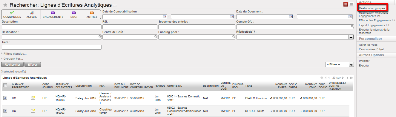 A partir des vues Option 1 ou 2, sélectionnez les lignes comptables analytiques que vous souhaitez réallouer