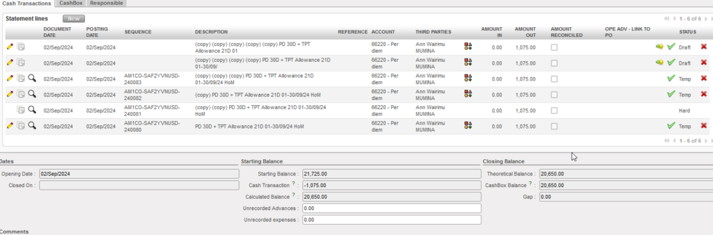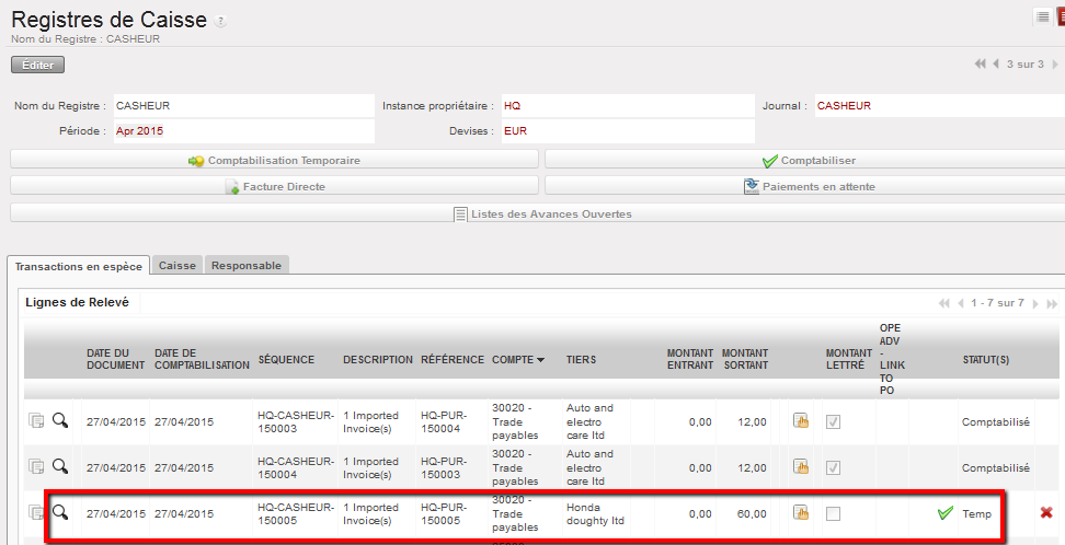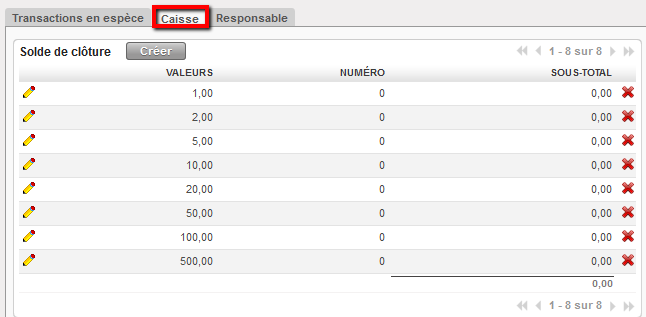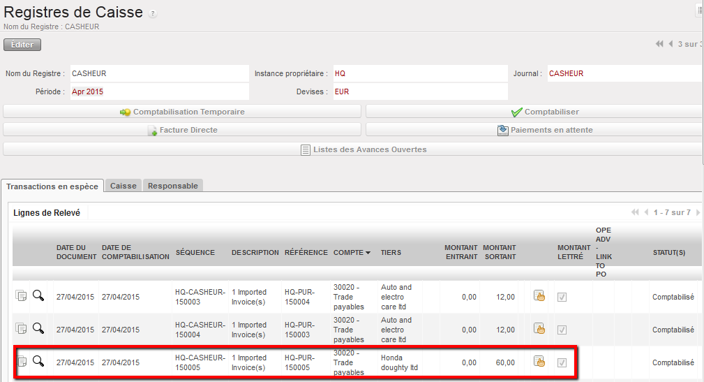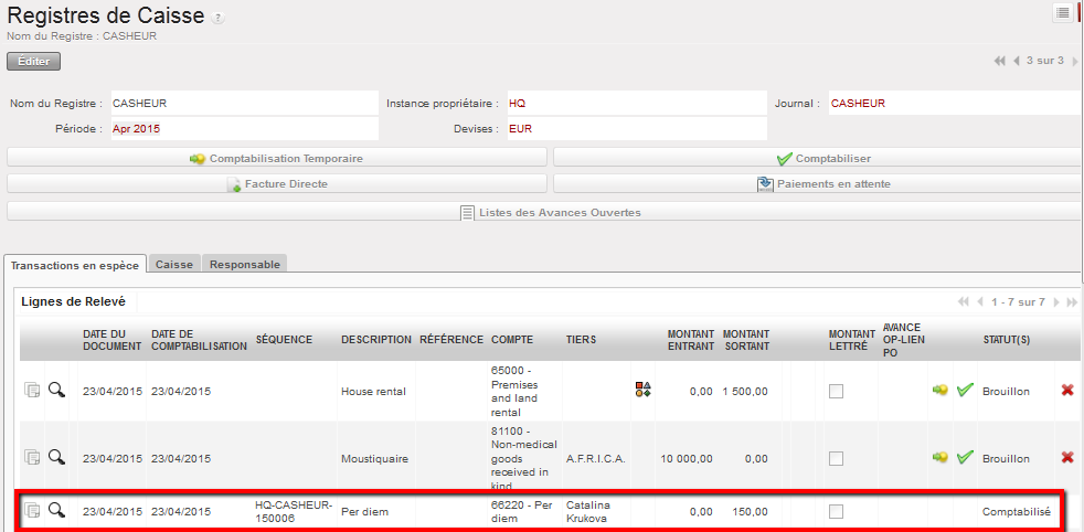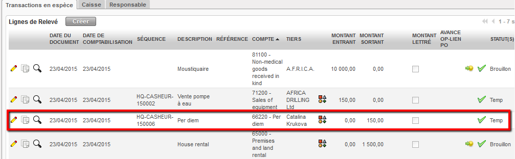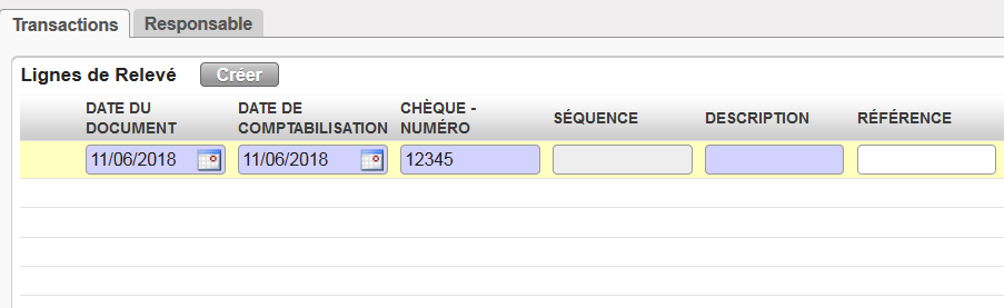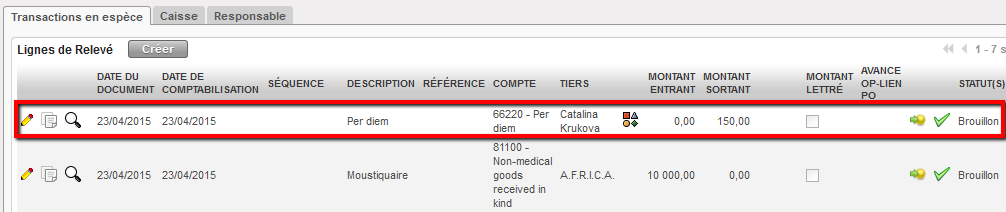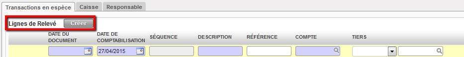 d’édition pour en ouvrir le formulaire. - Dans le champ {Transactions en espèces}, cliquez sur {Créer} pour créer une nouvelle ligne d’écriture.