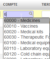 En sélectionnant {COMPTE} et en saisissant les premiers numéros du code ou un mot clé dans le champ de description, UniField affiche les options correspondant à votre recherche (voir ci-dessous). Lorsque vous passez votre souris sur les résultats la totalité de la description s’affiche.