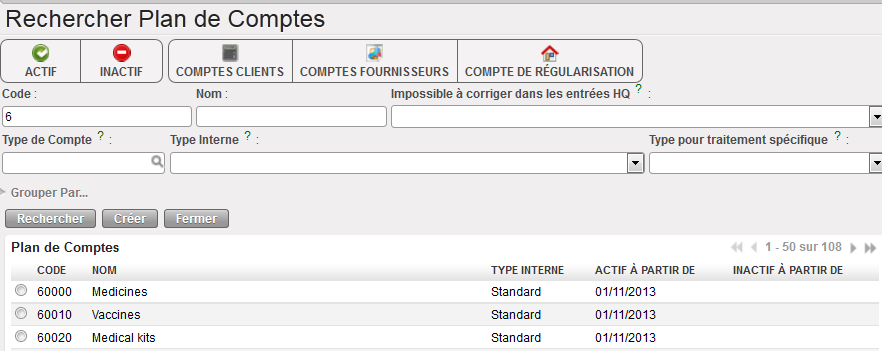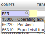 Entrée de valeurs pour rechercher un code comptable dans le champ {COMPTE}