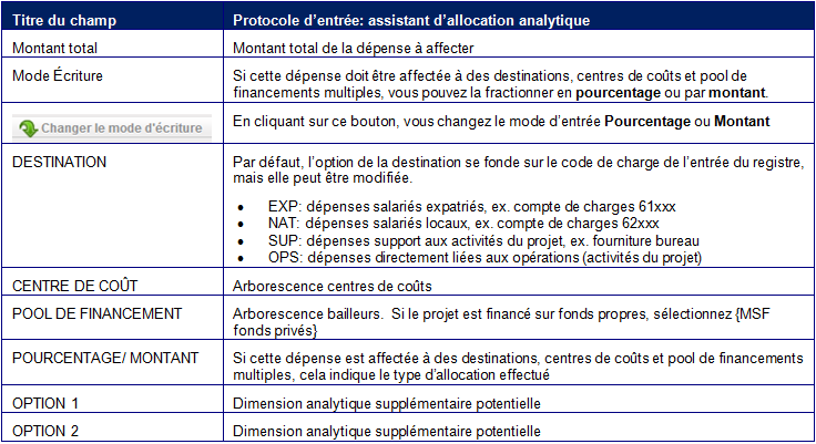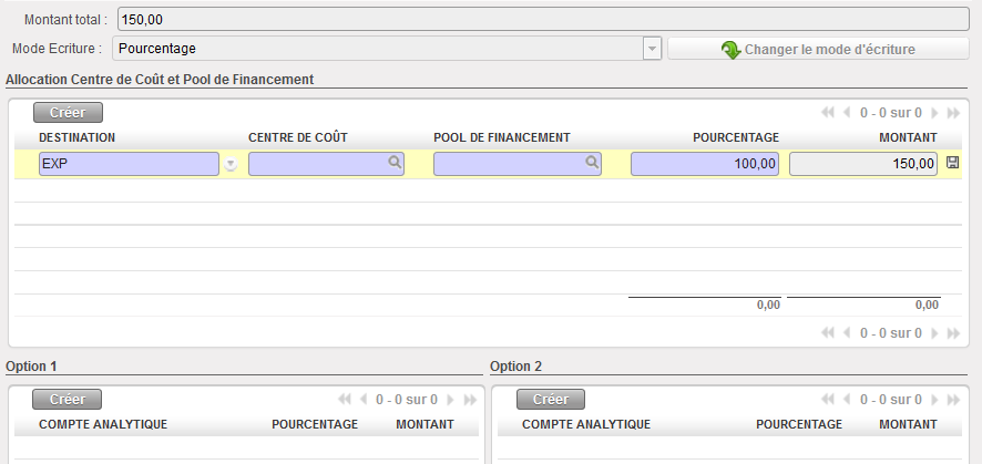 pour ouvrir l’assistant {Allocation analytique} - Sélectionnez {Créer} dans l’assistant pour créer une nouvelle allocation. La destination est complétée par défaut.